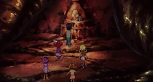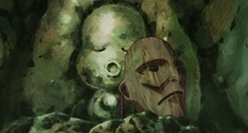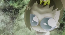 They get lost and run into a lonely tree, that has a cave-like interior. There, Aiko tells Momoko about the incident with her grandfather when she was three, and how that has affected her to this day. She feels better after it, and then they realize that the Frog Stone has actually been inside the tree all along. The other part of the gang encounters another "spirit", this time around wearing Mayuri's mask.